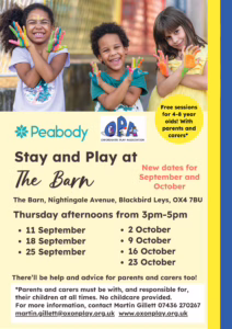 We are delighted to confirm that Thanks to continued support from Peabody Housing our Thursday afternoon, Stay & Play sessions at The Barn in Blackbird Leys will restart this Thursday 11th September